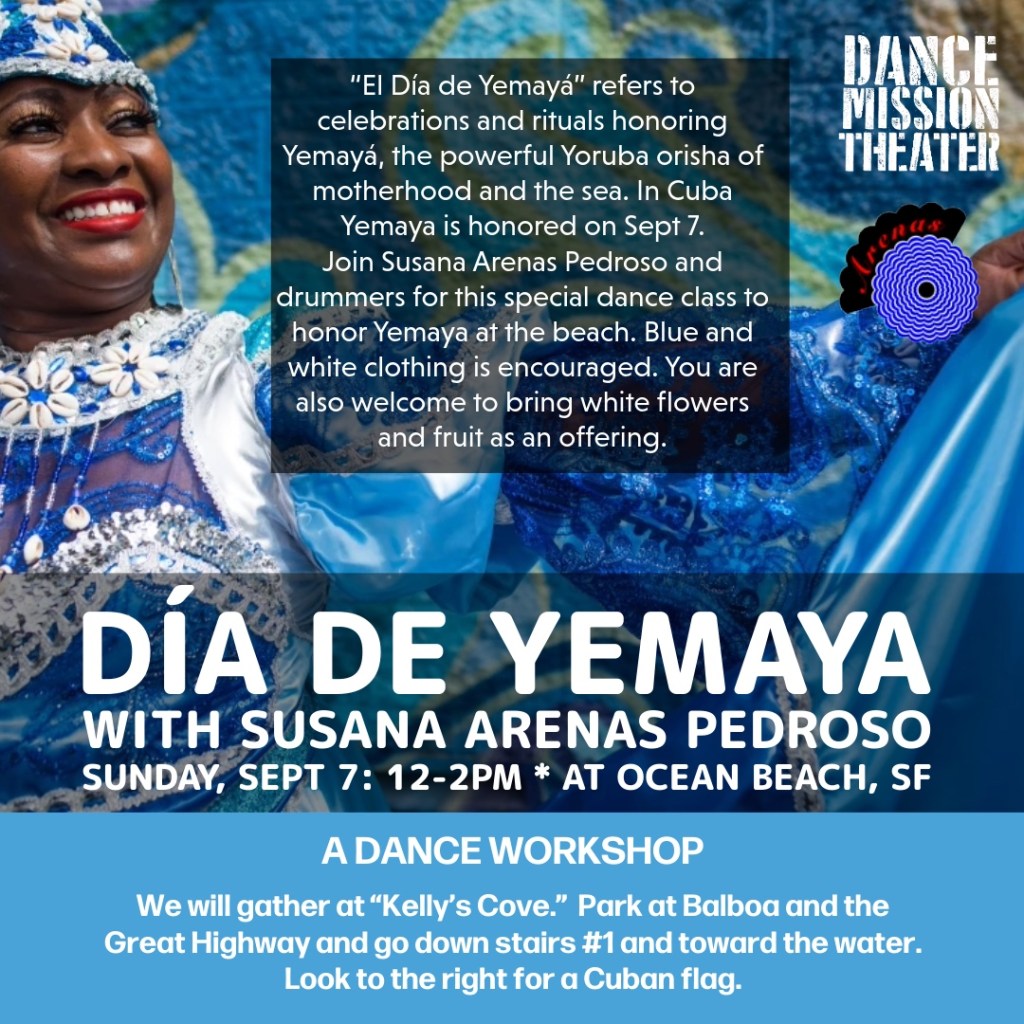 “El Día de Yemayá” refers to celebrations and rituals honoring Yemayá, the powerful Yoruba orisha of motherhood and the sea. In Cuba Yemaya is honored on Sept 7. Join Susana Arenas Pedroso and drummers for this special dance class to honor Yemaya at the beach. Blue and white clothing is encouraged. You are also welcome to bring white flowers and fruit as an offering.
