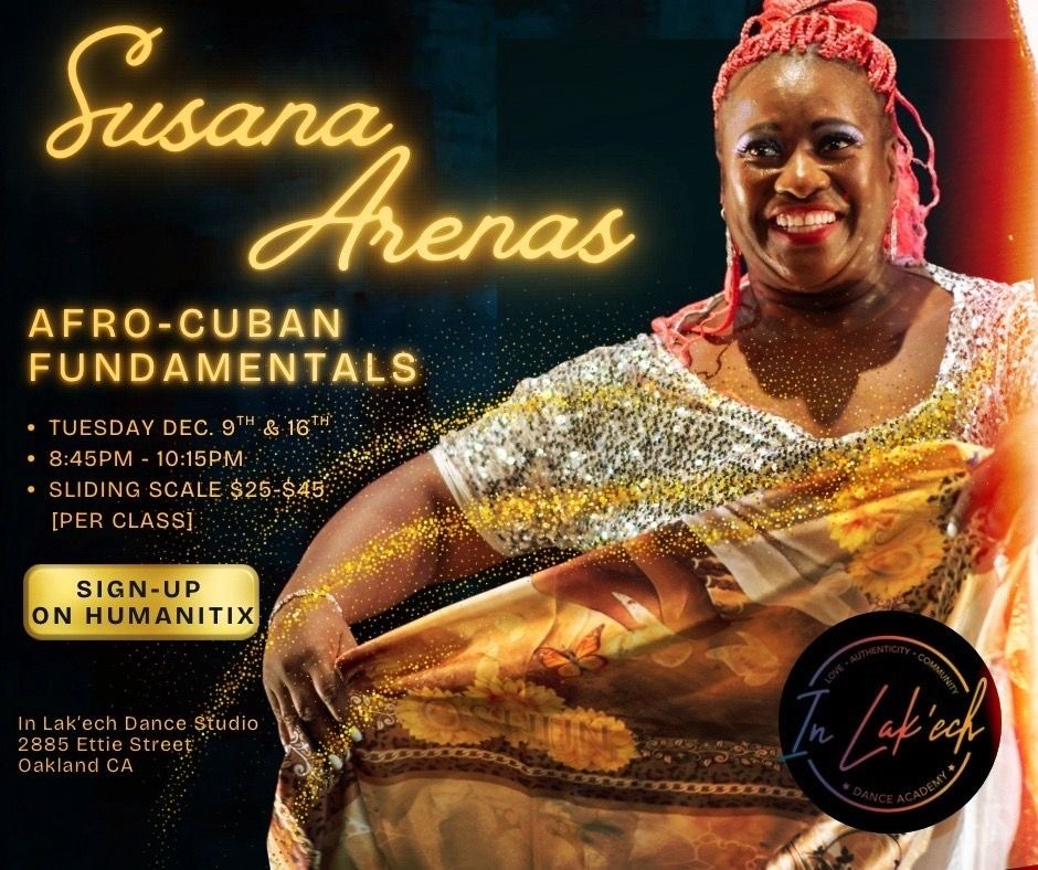 Susana Arenas Pedroso is teaching two workshops on Dec 9 & Dec 16 from 8:45-10:15pm at In Lak’ech Dance Studios in Oakland. Class is sliding scale $25-$45. (She will still be teaching her weekly Tuesday class at Dance Mission in SF on these days).